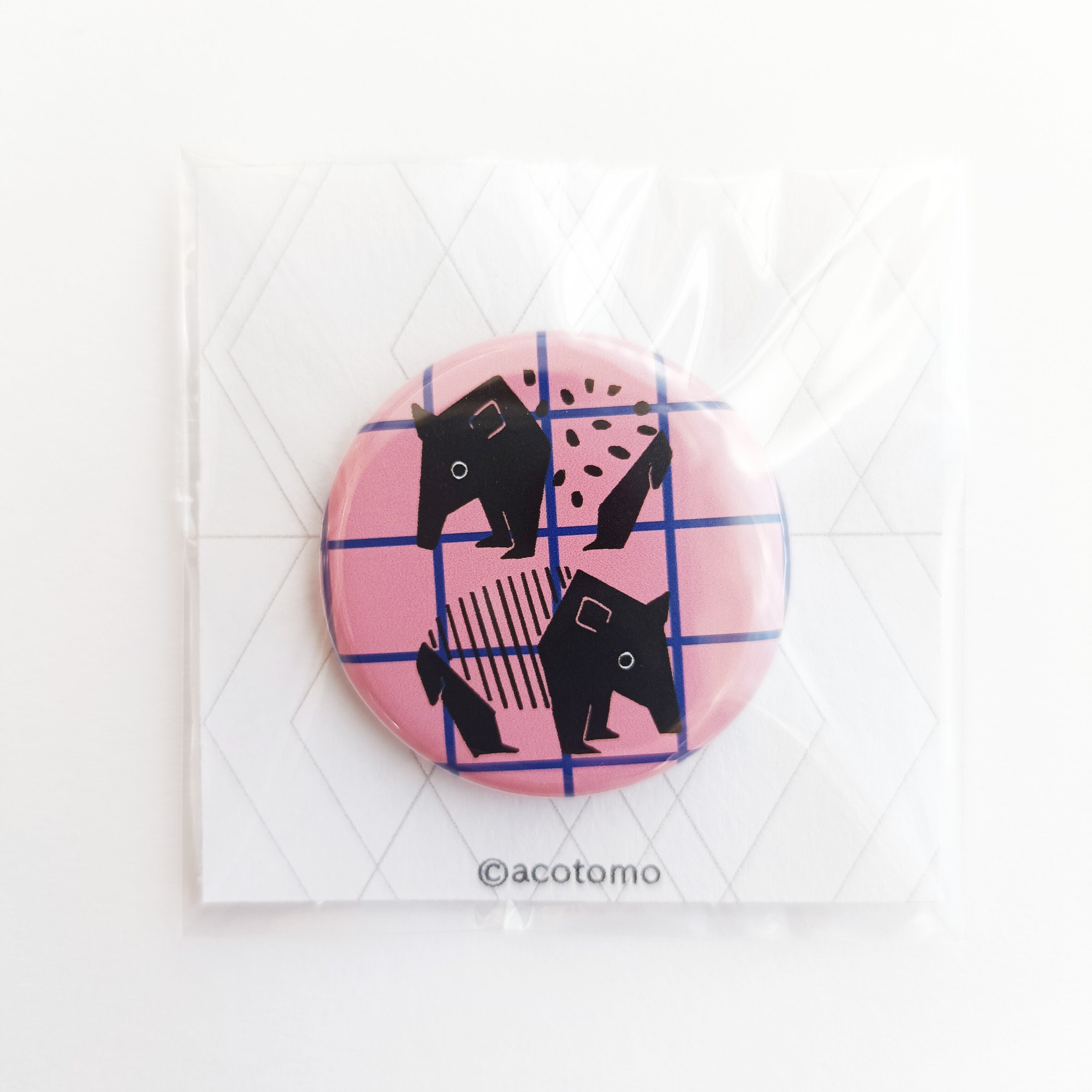 夢見るバクの缶バッジ(ピンク 格子柄)です。